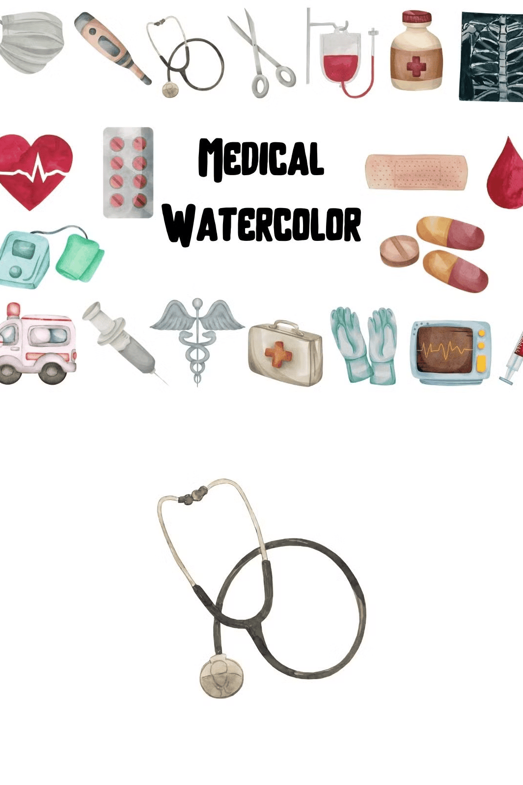– **20 Distinct Watercolor Illustrations**: From stethoscopes and syringes to heartbeats, pills, and hospital scenes—each icon captures a medical theme with authentic, artistic flair.