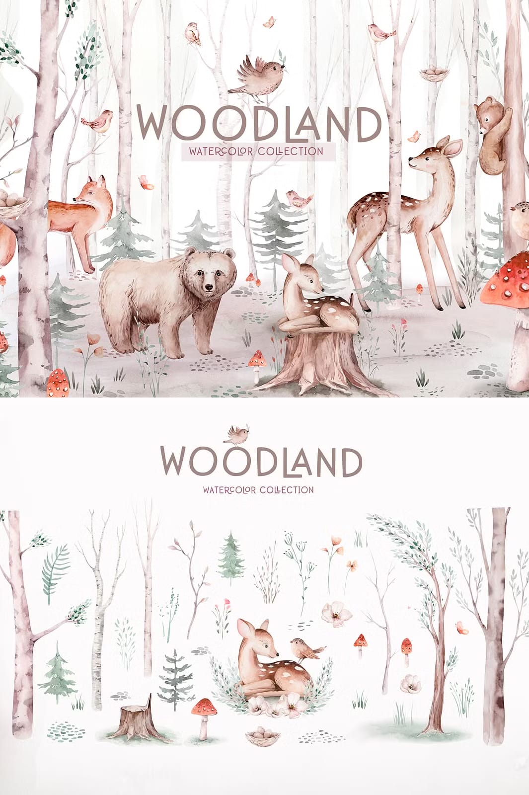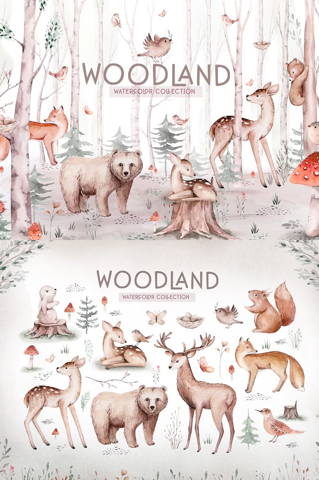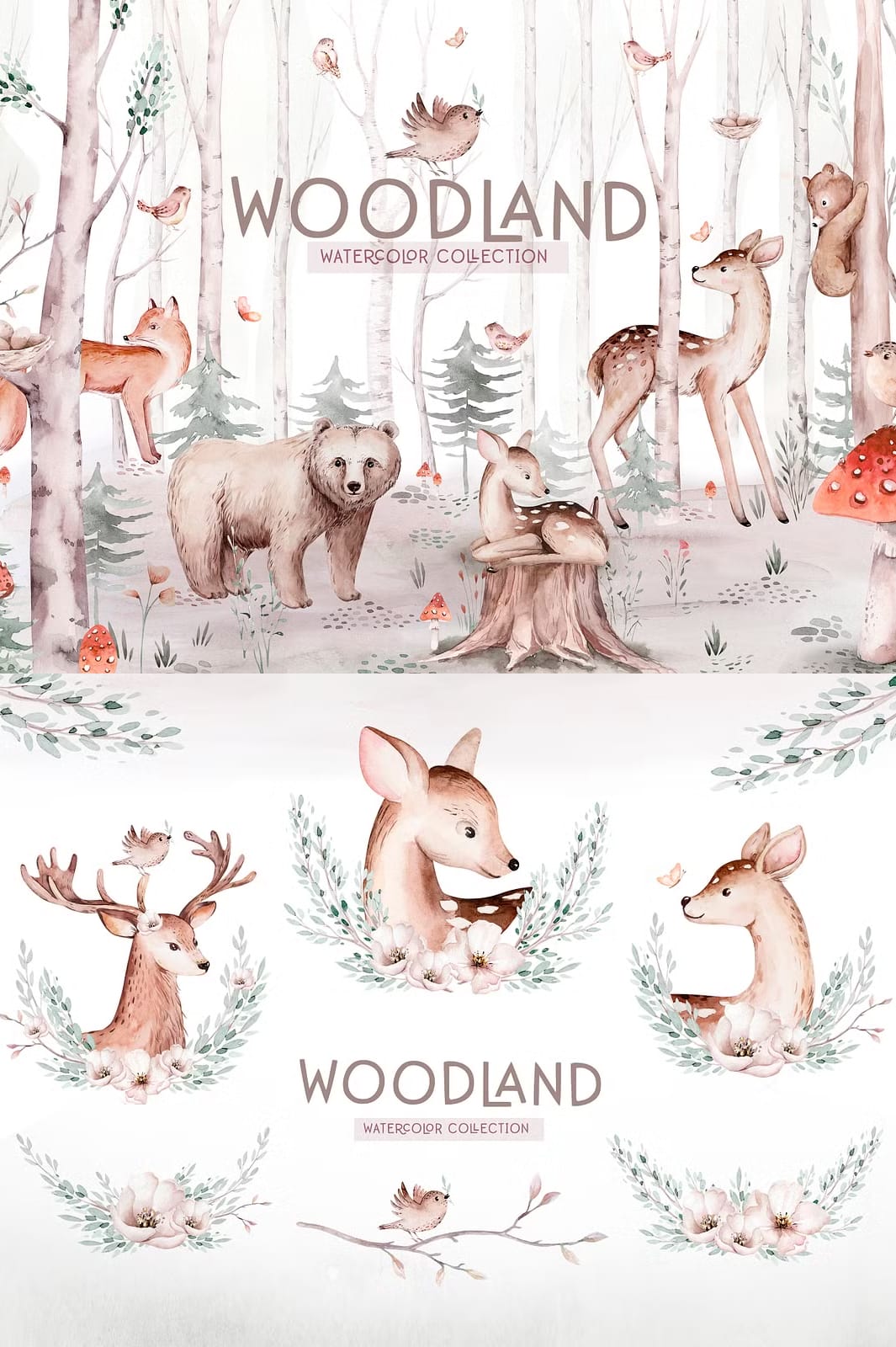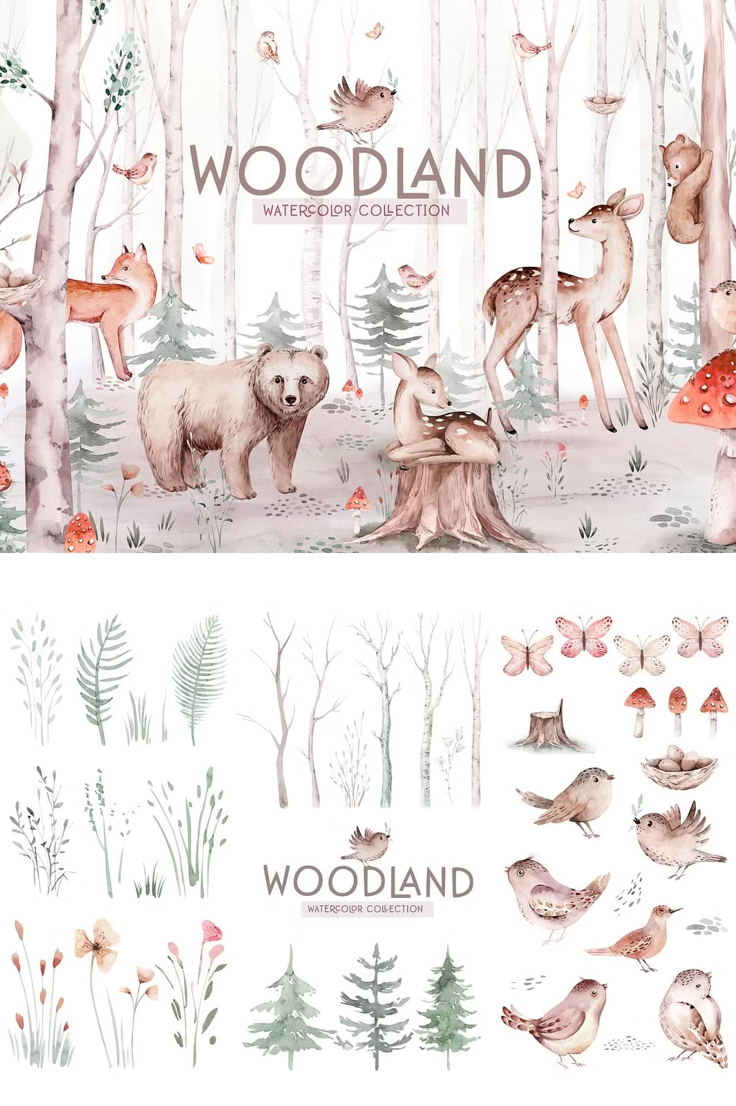 Discover the exquisite Watercolor Woodland Collection, a set of meticulously hand-painted forest-themed illustrations that bring nature’s beauty to life in your creative projects. This collection includes a diverse range of forest animals, trees, and floral elements, carefully crafted to add authenticity and charm to your design work. Whether you are creating invitations, digital art, branding materials, or craft projects, this collection equips you with versatile imagery to unleash your creativity.