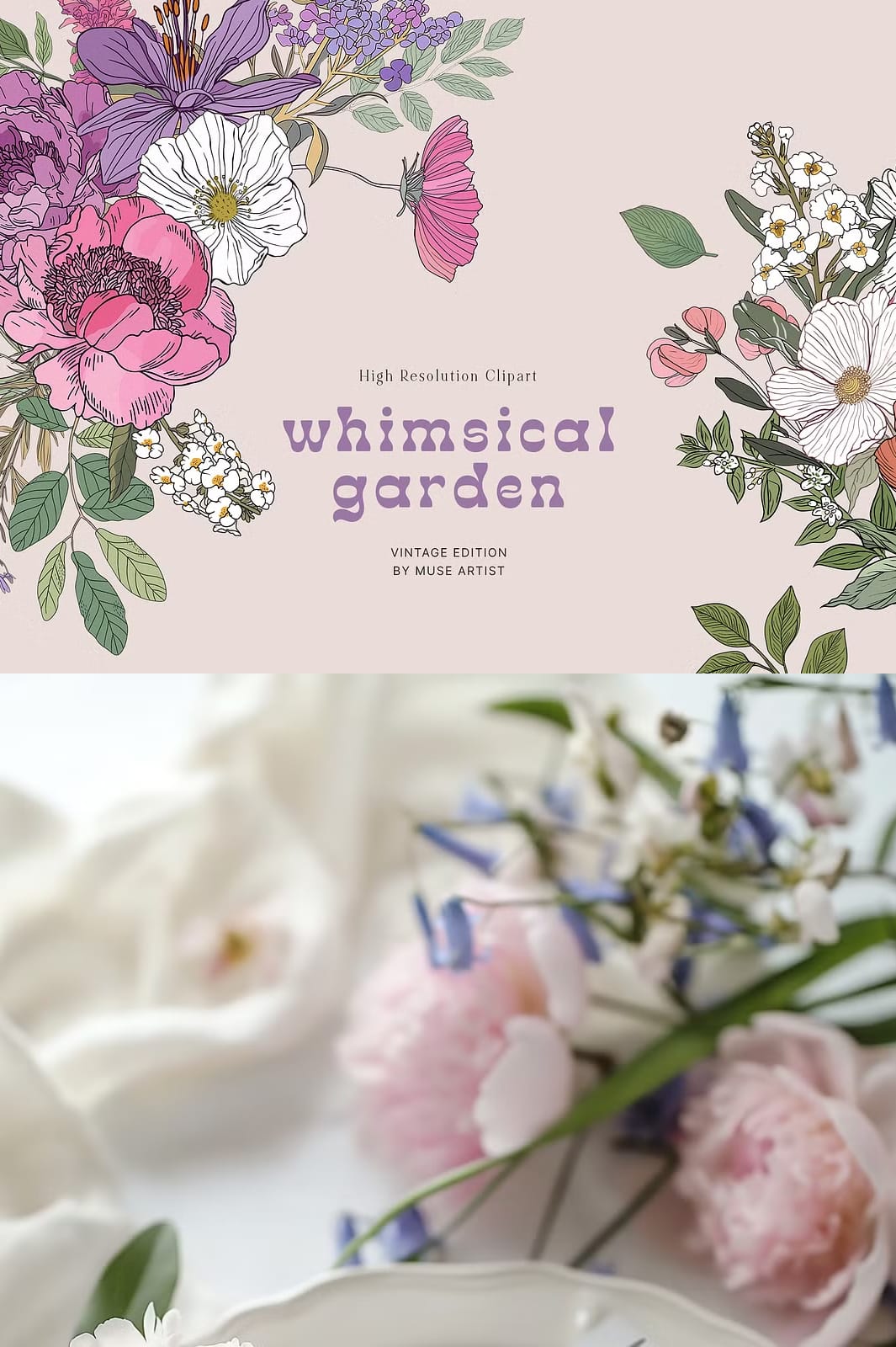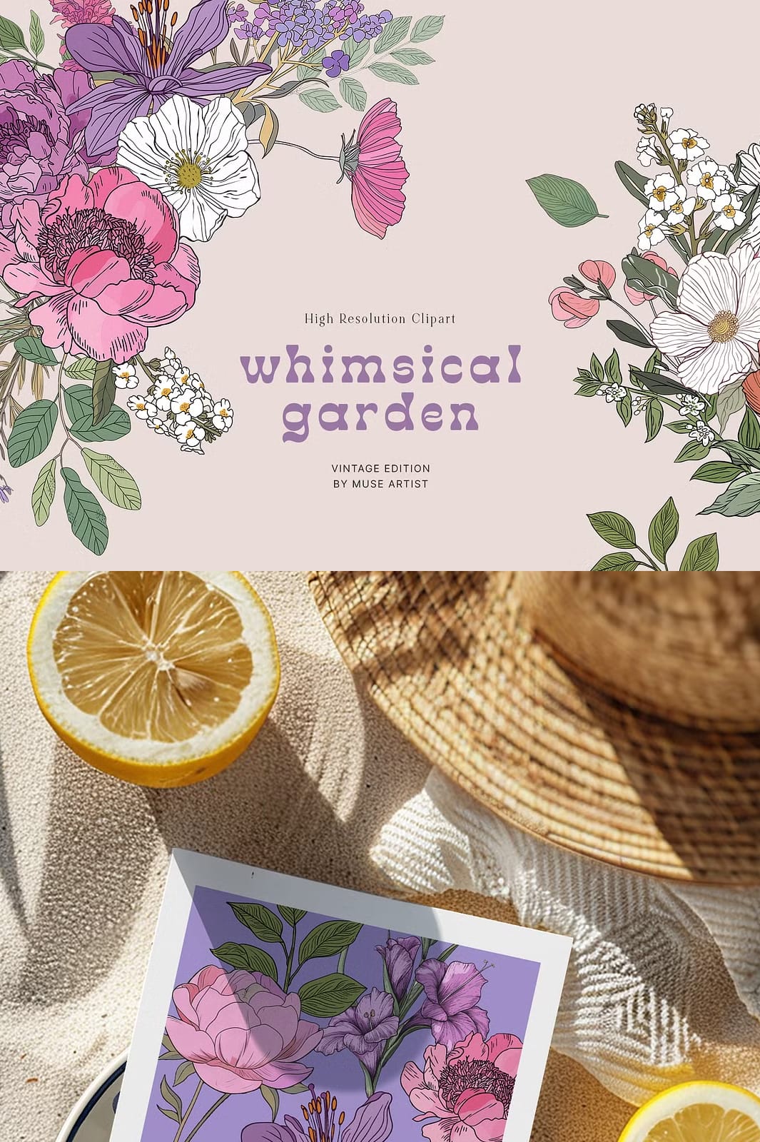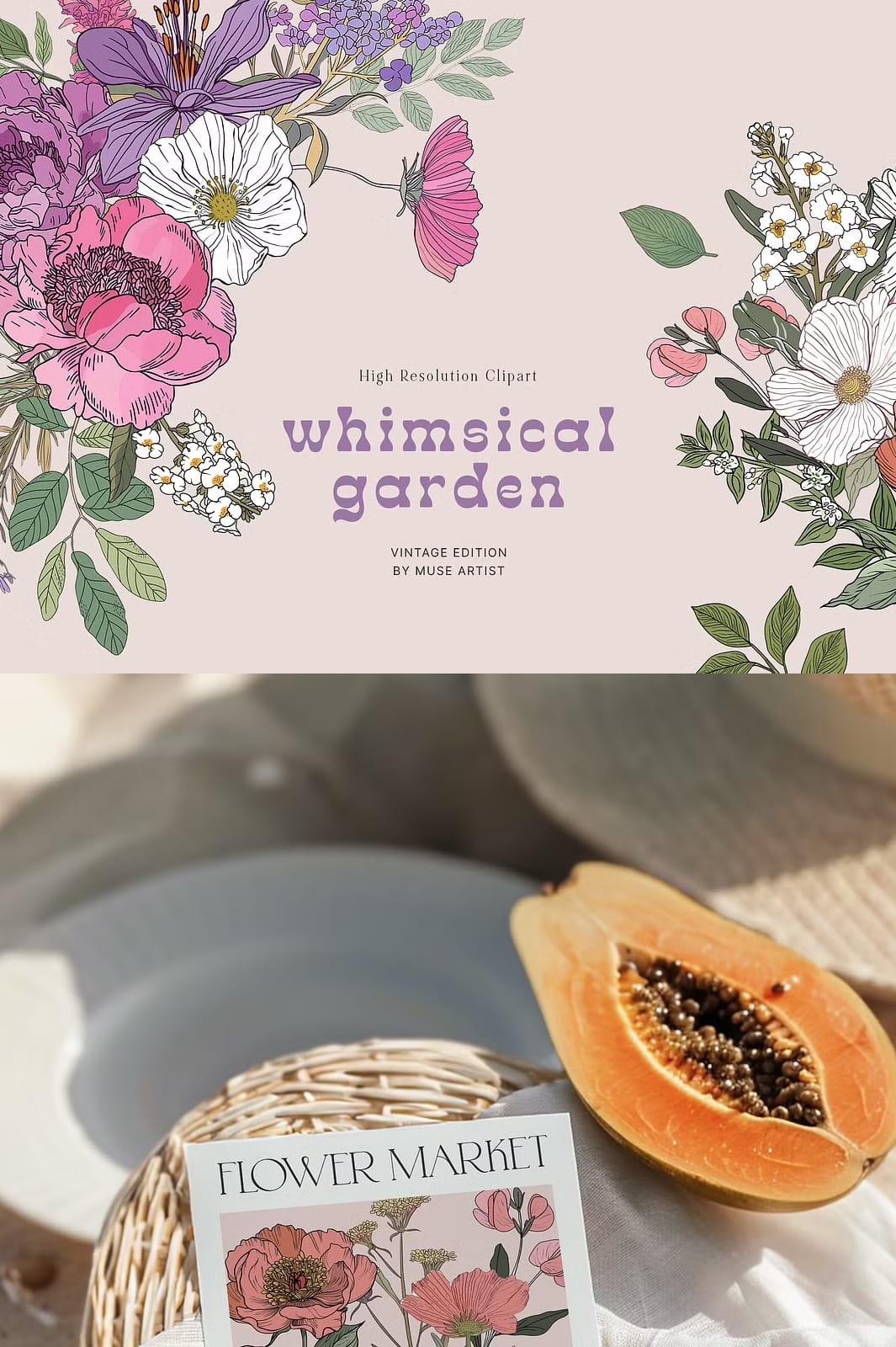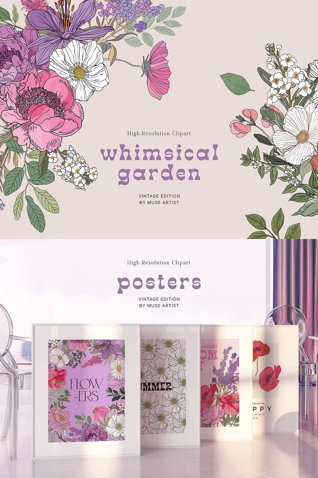 Immerse yourself in the vibrant Whimsical Garden collection, a stunning array of colorful flowers, unique patterns, intricate compositions, and stylish prints inspired by juicy summer blossoms and groovy botanicals. This collection is crafted to elevate your creative projects, offering everything you need to design eye-catching wedding invitations, posters, packages, postcards, greeting cards, printed fabric, and beyond. Its lively designs add elegance and freshness, making each project stand out with a natural beauty that captivates and inspires.