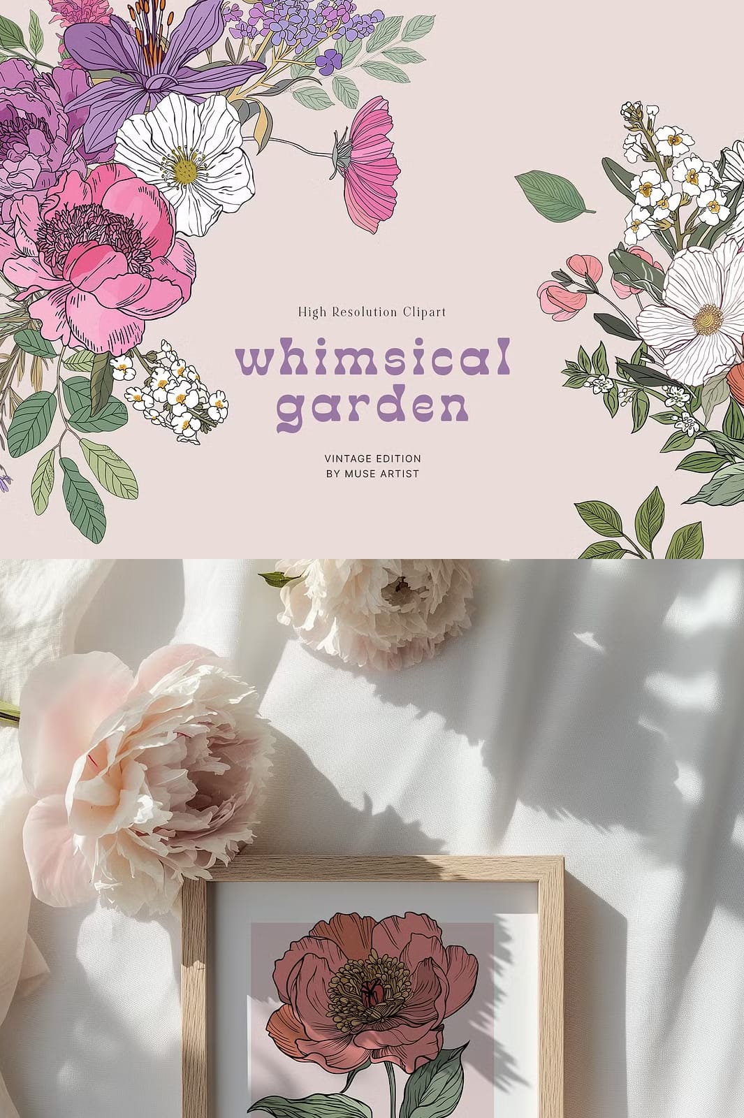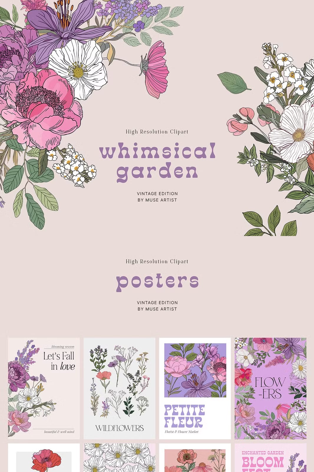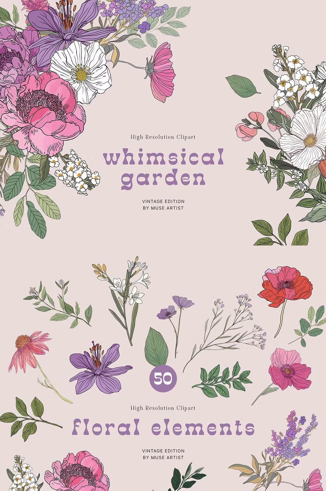 Whimsical Garden’s carefully designed floral motifs and dynamic compositions are ideal for creatives seeking to produce elegant and distinctive projects. Whether you’re designing sophisticated wedding stationery, crafting personalized greeting cards, or producing fabric prints with botanical charm, these patterns and elements provide the perfect foundation. Each piece invites you to innovate while maintaining a cohesive and visually appealing aesthetic that spells refinement and grace.