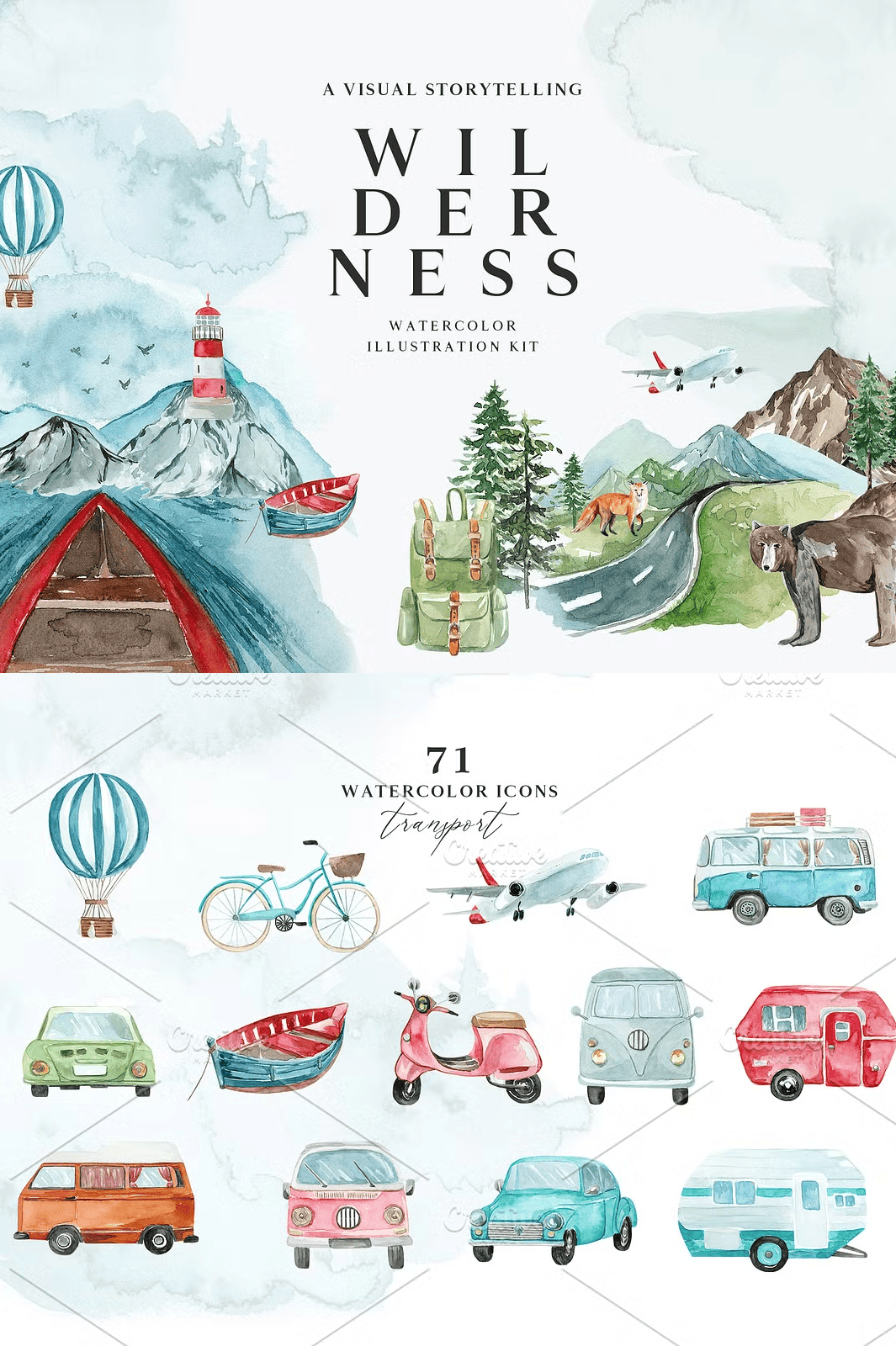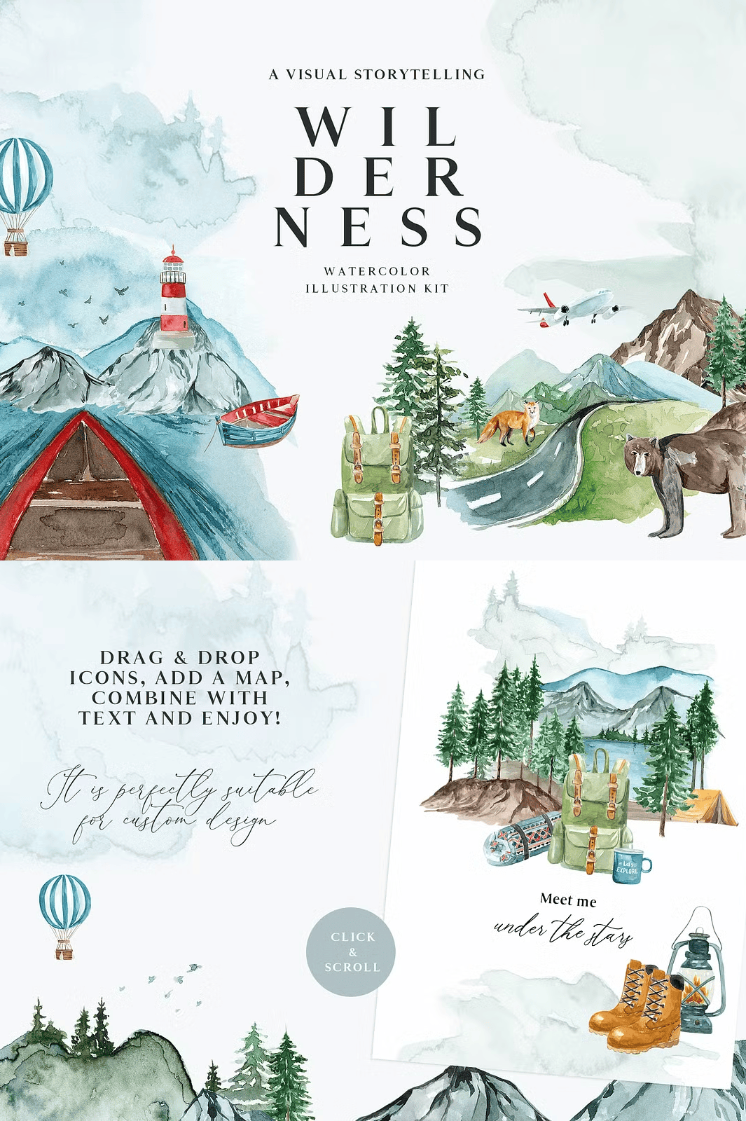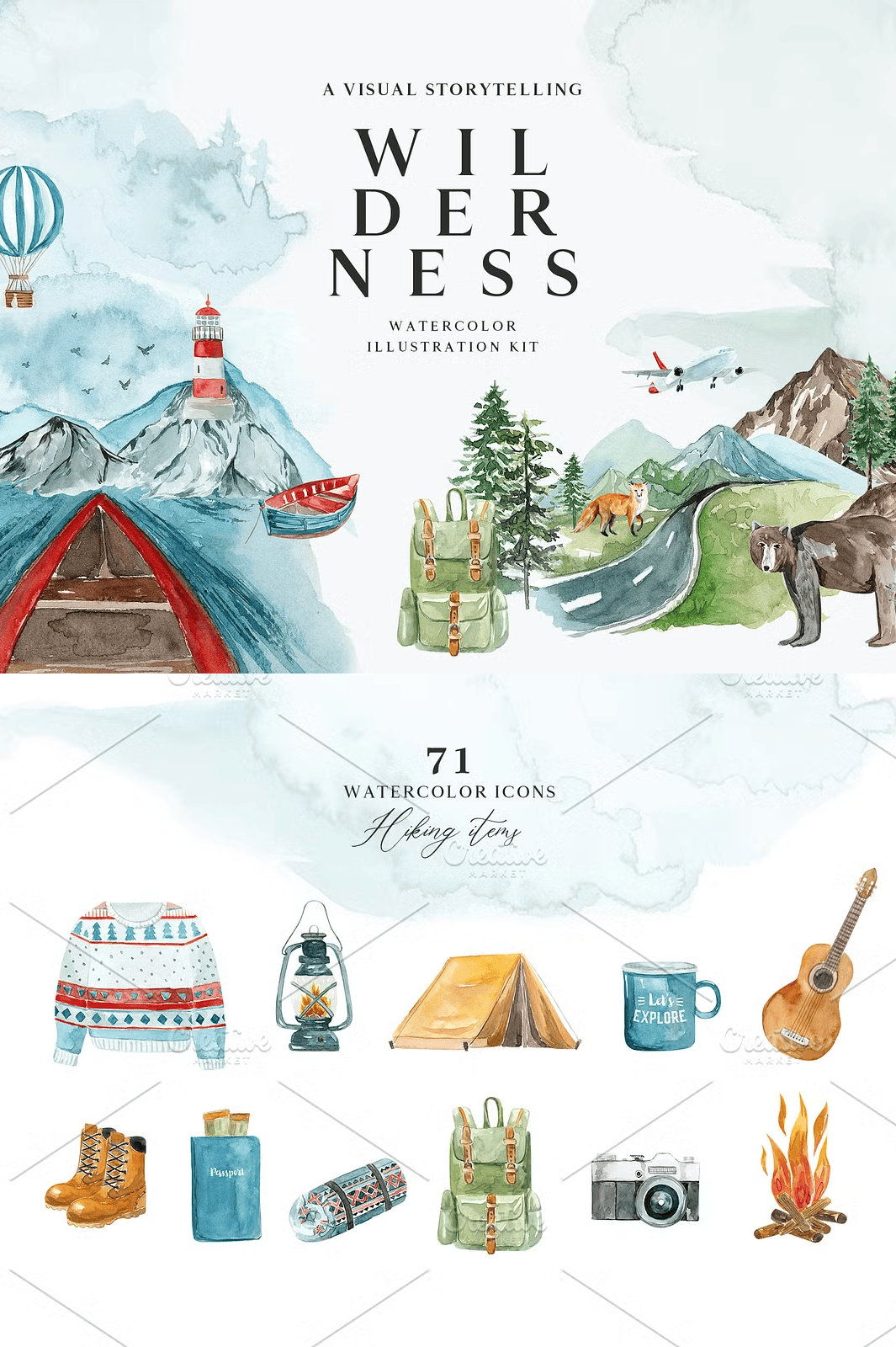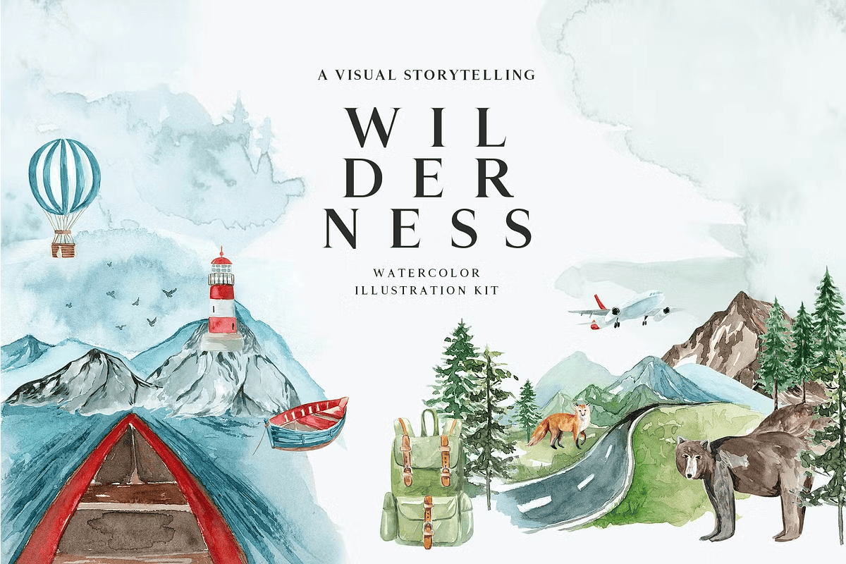 Step into the world of adventure with the Wilderness Visual Storytelling Collection, meticulously designed for travelers, hikers, and all outdoor enthusiasts. This expansive set of 129 high-quality, hand-drawn elements and watercolor illustrations invites you to craft your own vivid tales—whether it’s a road trip, a weekend getaway, a honeymoon, or a camping gathering around the bonfire. Capture your journeys in expressive visuals, design memorable posters, postcards, and logos, or give personalized gifts that tell a story.