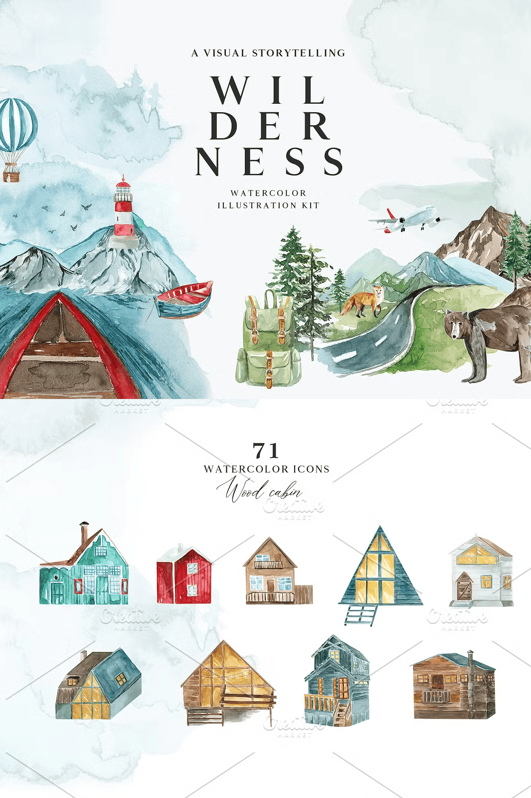 - 71 Watercolor Icons including detailed mountain and tree designs, transport icons, hiking gear, animals, and cozy wood cabins.