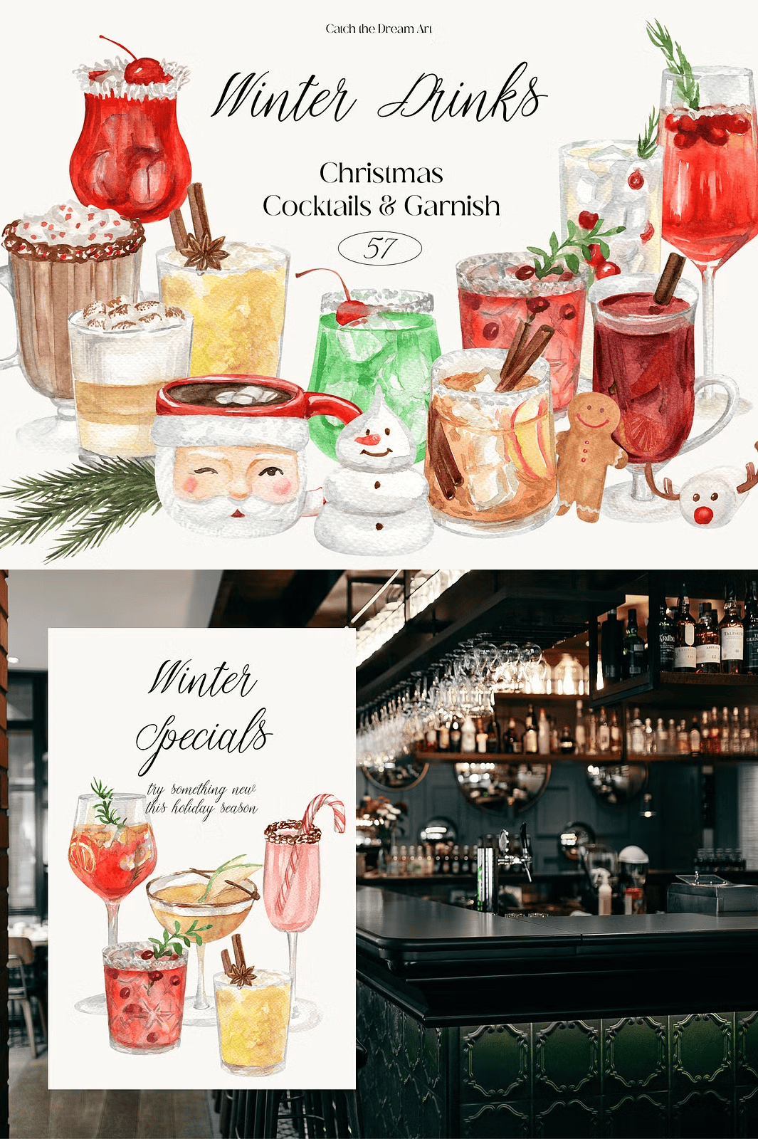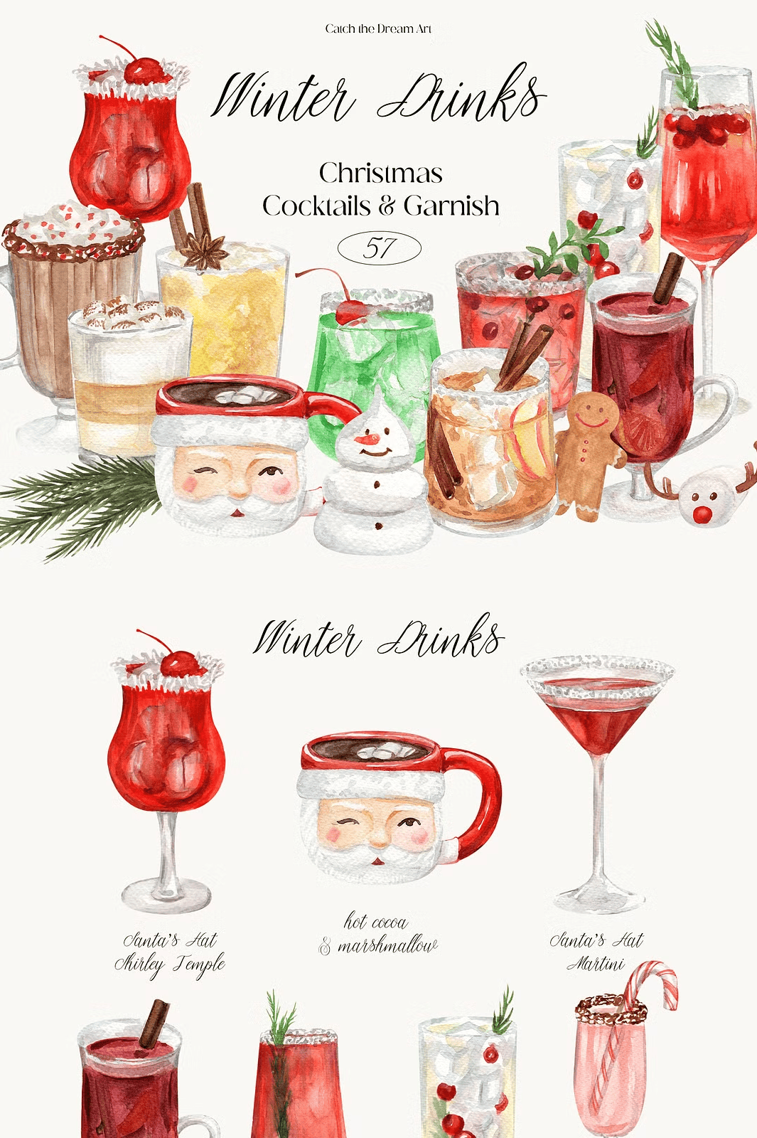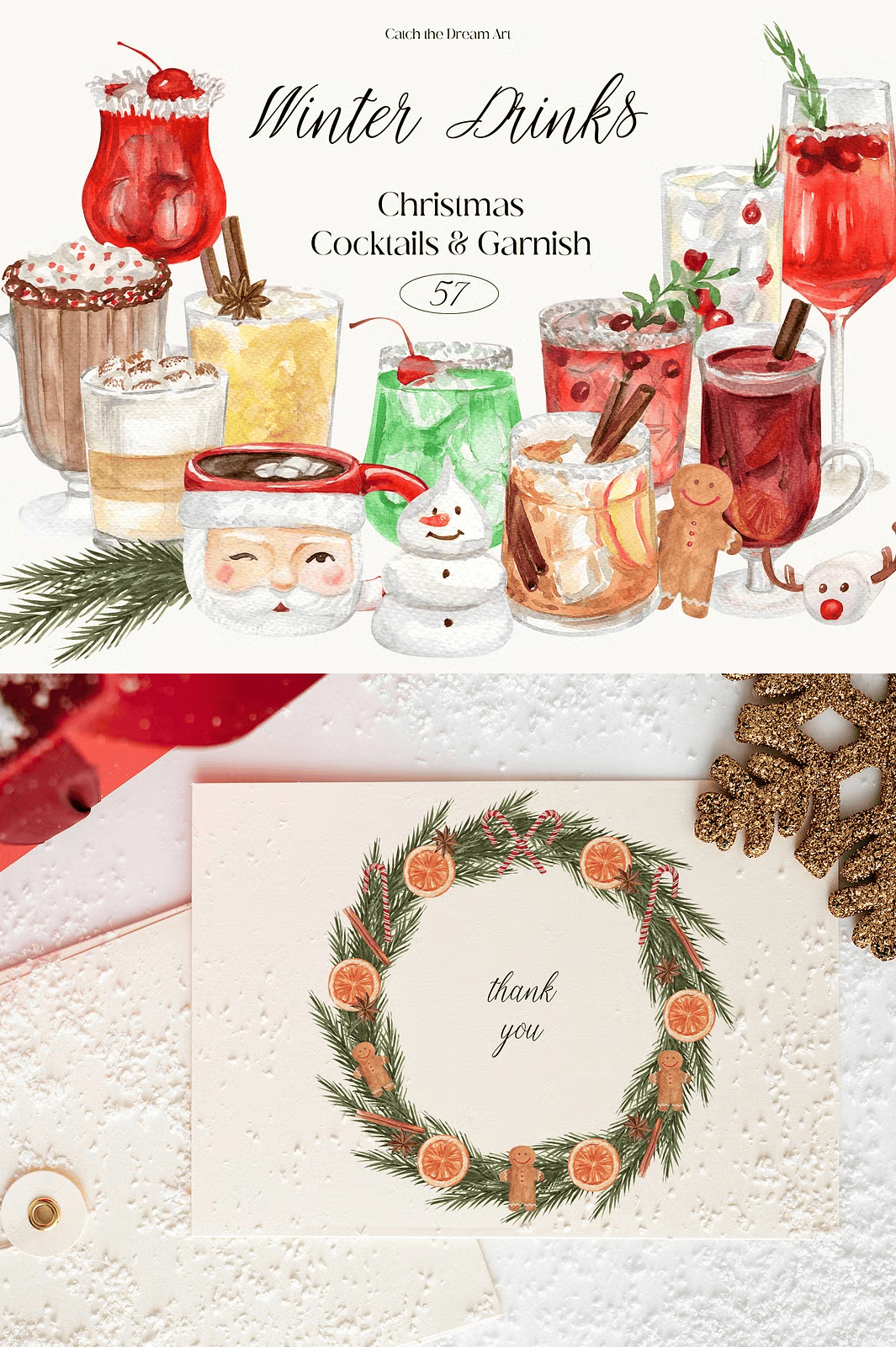 • 24 Cozy Garnish Elements — Perfect for topping drinks or adding festive flair. Includes cinnamon sticks, cranberry sprigs, peppermint sprigs, festive ribbons, pinecones, and more — all hand-drawn with holiday spirit.
